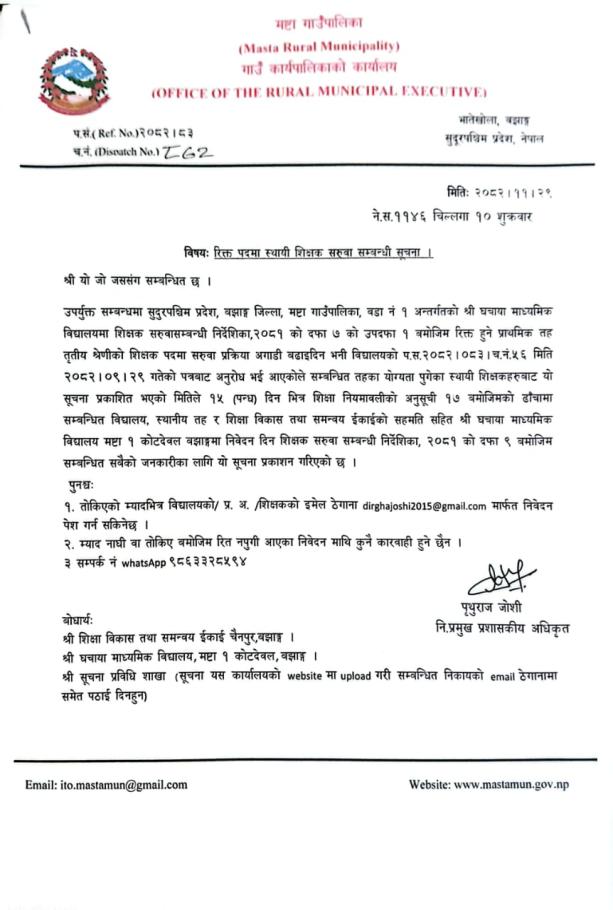 रिक्त पदमा स्थाई शिक्षक सरुवा सम्बन्धि सूचना